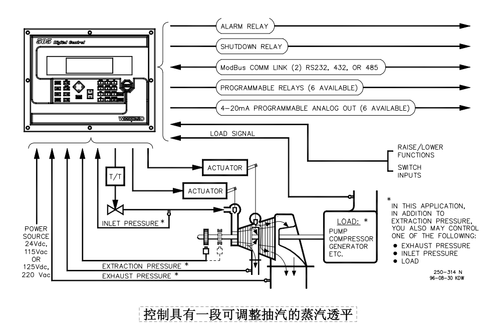 505/505E控制器是专为各种结构尺寸的蒸汽轮机控制而设计的。505适用于驱动具有一个或两个进汽阀执行器的汽轮机。505E适用于单一抽汽和/或补汽式汽轮机。505/505E控制器均为现地可编程形式。控制器的编程菜单使现场工程师可以根据发电机应用或驱动机械负荷应用的要求有针对性的配置参数。505/505E可独立运行,也可与分布式控制系统(DCS)结合使用。